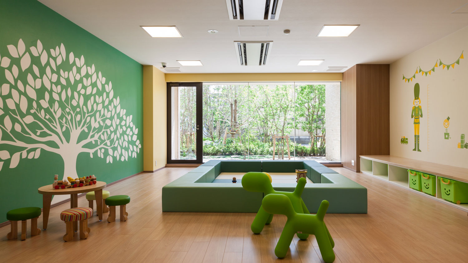 子育て世代の交流を育む憩いの空間と、子どもたちが雨の日でも遊べるキッズコーナーが一体となった空間です。