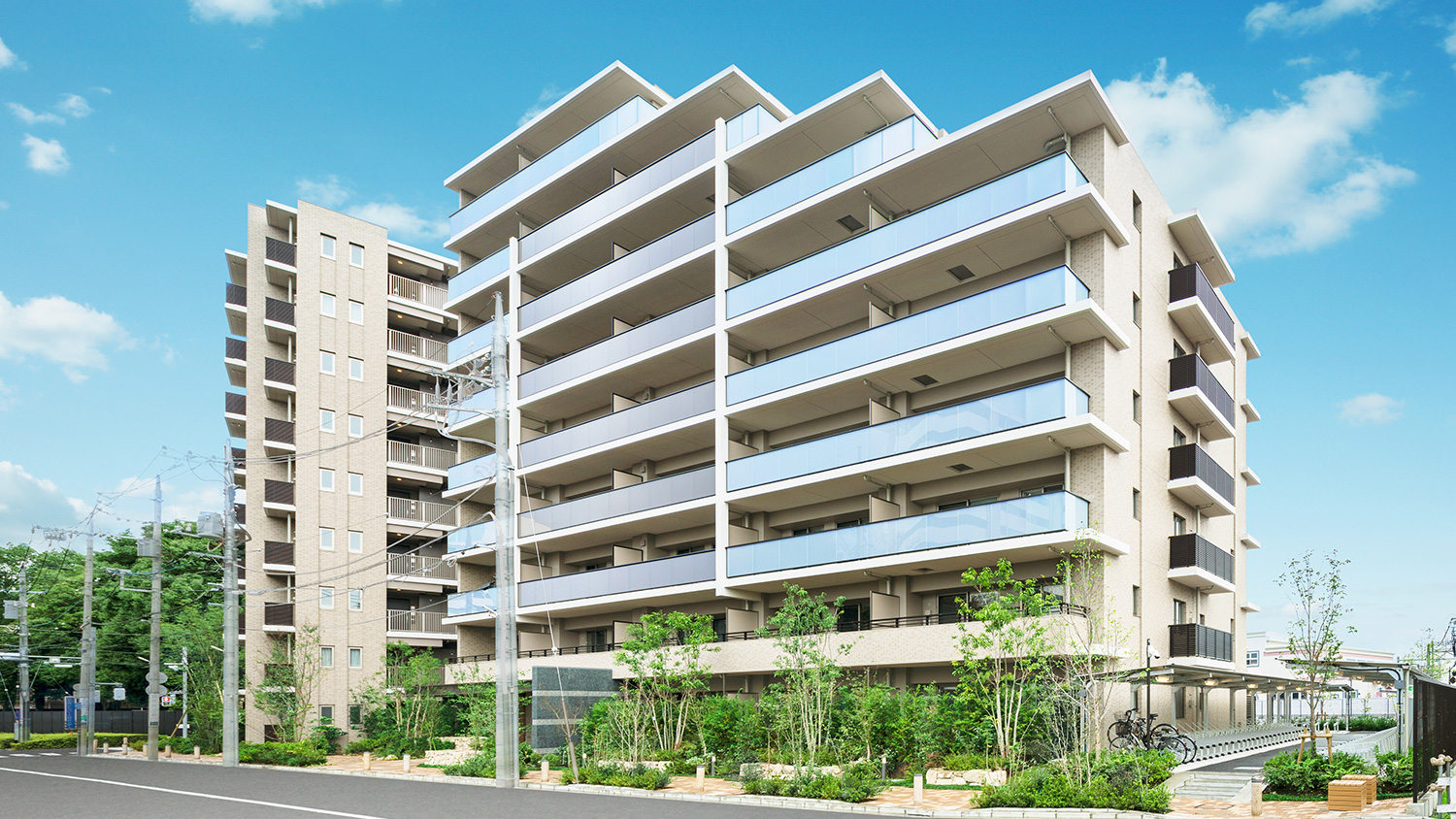ガラス手すりを用いた素材の趣と雁行造形のスタイルは、街並みに新しい風景を描きます。