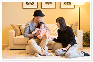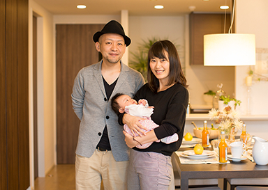 「私は、和室があるのが希望で、そこでコタツを出したりしたいと思っていました。床暖房や浴室乾燥機などの設備も充実していて、とても良いですね。収納がたっぷりあるのも嬉しいです。周辺には小児科もあったり、学校へも近く安心です。子育てするにはぴったりの場所だと思っています。」(妻)