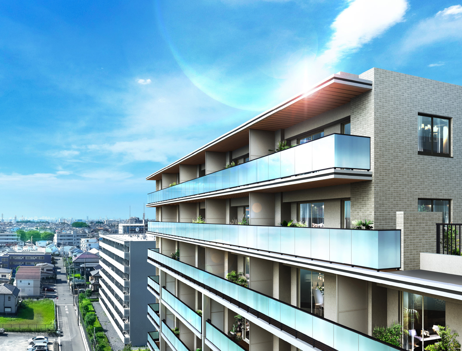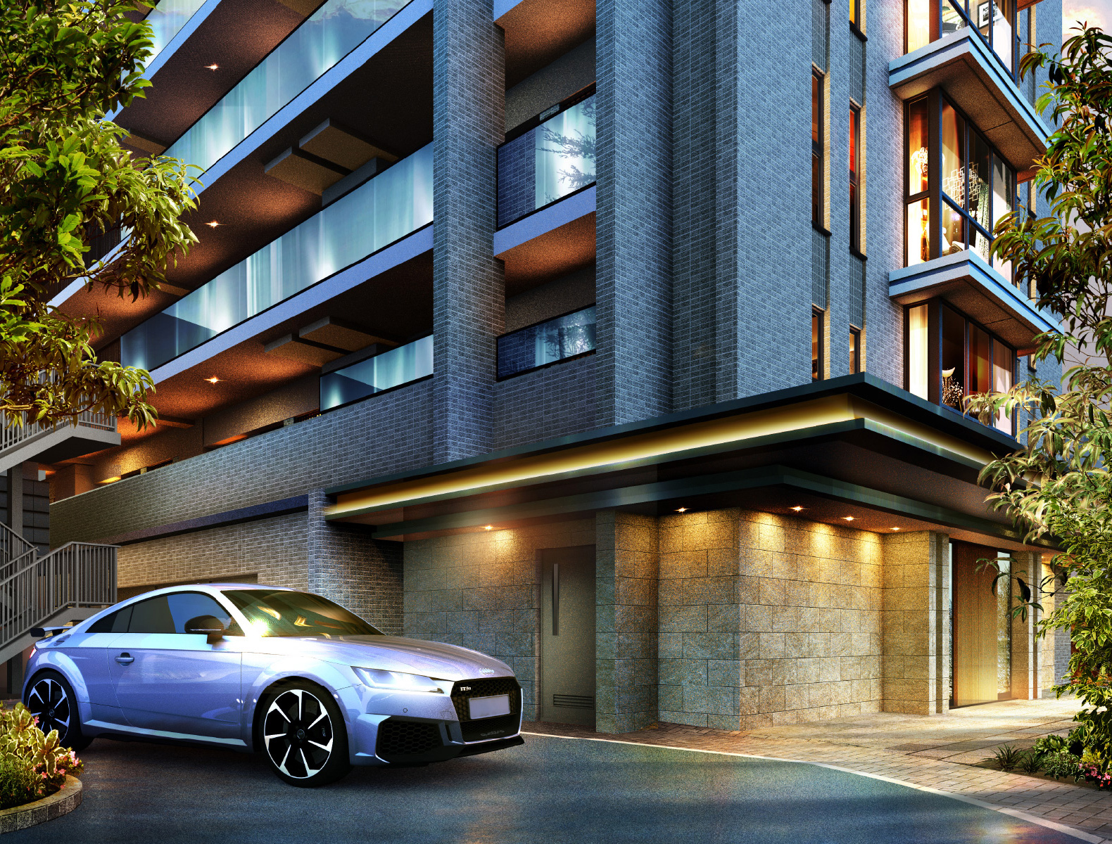 掲載の完成予想CGは計画段階の図面を基に描いたもので実際とは異なります。また、外観の計画は今後変更になる場合があります。なお、外観の細部・設備機器・配管類及び電柱・架線・道路標識・周辺建物等は一部省略または簡略化しております。植栽につきましては特定の季節の状況を表現したものではなく、竣工時には完成予想図程度には成長しておりません。タイルや各種部材につきましては、実物と質感・色等の見え方が異なる場合があります。植栽は特定の季節の状況を表現したものではなく、竣工時には完成予想図程度には成長しておりません。 ボリューム・形状は実際と異なる場合があり、樹種等は変更となる場合があります。