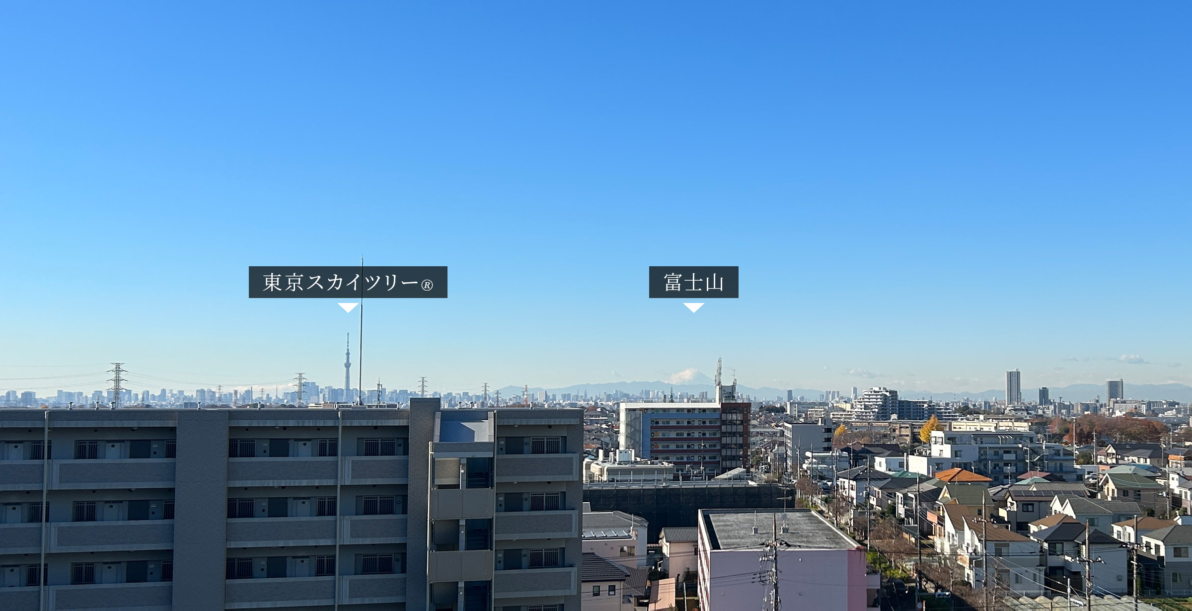 掲載の眺望写真はAタイプ・801号室から撮影(2025年12月)したものです。 眺望は住戸により見え方が異なり、富士山や東京スカイツリー®が見えない住戸もございます。写真左下に写っている本計画西側に隣接する建物にはリノベーション工事の予定があり当該建物の外観等に変更が加わる予定です。周辺の環境は変わる可能性があり、眺望は将来に渡って保証されるものではありません。