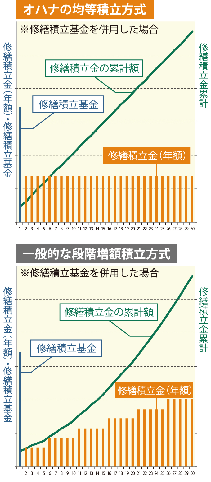 長期修繕計画で想定される定期的な修繕工事 の資材やその数晟等を試算の上、今後見込ま れる工事費用を算出。これにより30年間の長期 修繕計画に対応する推定総額を算出し、その 総額を同期間の月数で割り戻して毎月の積立 月額を計算する方法を「均等積立方式」と言い ます。定期的に積立額を増額していく前提の 「段階積立方式」とは異なり、原則として均等の 積立額を保っていくことをH指すのが「均等積 立方式」で、将来の支出が把握しやすくなると いうメリットがあります。但し、試算時点の時価に 応じて計算した工事費用のため、その後の建 物・設備の劣化状況や材料費・工事費等の物 価変動等により、30年以内であっても積立に不足が生じ、計画外の修繕積立金培額又は一時 金が発生する場合もございます。