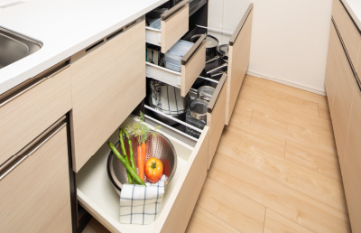 キッチンの大きな鍋や食器、瓶類などを効率的に整理できるスライド収納を採用。整理しやすく取り出しやすい仕様です。