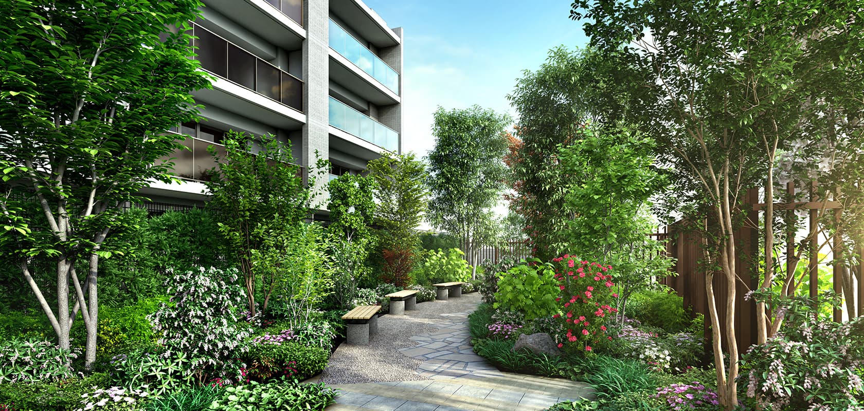居住者以外は自由に出入りできないプライベートな空間とし、豊かな植栽やベンチを計画。