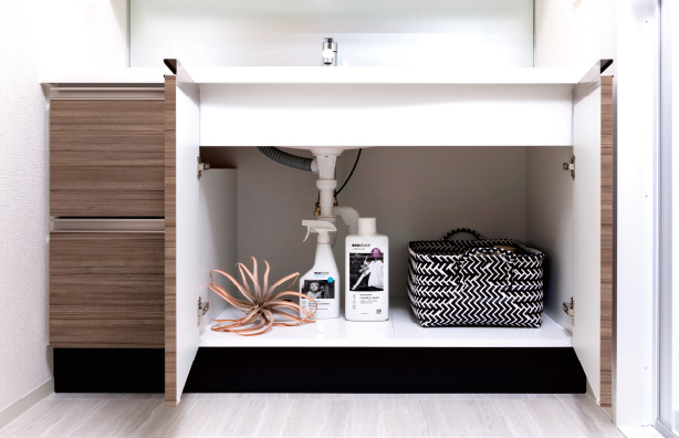 洗面ボウル下のスペースをより広く。大きなバケツもラクラク収まります。